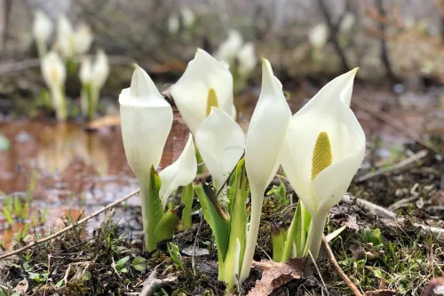 Skunk cabbages herald the arrival of spring in Norikura Kogen. Ichinose, where the skunk cabbages grow in colonies, is one of the recommended trekking routes in spring and early summer. The skunk cabbage season is from late April to mid-May. After the skunk cabbage season is over, white flowers of plum, pear, and Japanese cinnamon bloom one after another, and azalea azaleas are at their best from mid to late June.
