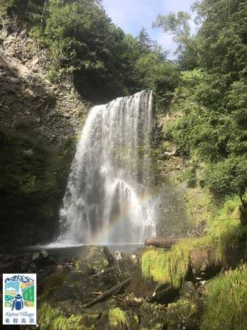 The waterfalls are a great place to enjoy the exhilaration of splashing water near the basin! From the waterfall viewing platform, you can enjoy the breathtaking view of the waterfall cascading down with Norikura-dake (Mt. Norikura) in the background. A rainbow can be seen in the morning.