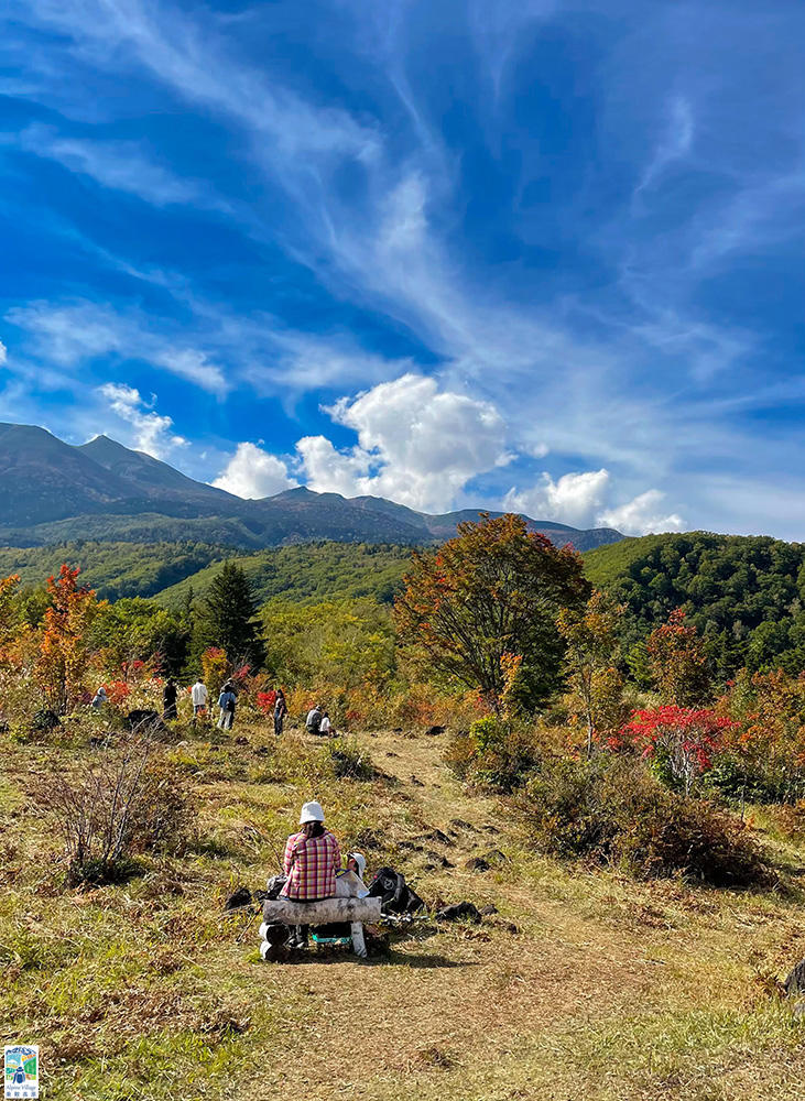 描述:乘鞍高原广阔的蓝天下,绚丽多彩的秋叶美不胜收。聚集于此的人们都被这美景深深吸引。
